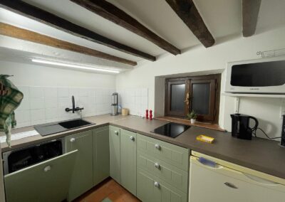 Das Haus bietet mit etwa 250 qm Wohnfläche Platz für bis zu 9 Personen, sowie drei Schlafzimmer, zwei Bäder mit Toilette und Bidet, Wohnzimmer mit TV und Küche mit zusätzlich offenem Kamin und einem großen Saal mit Kaminofen. Im unteren Geschoss steht Ihnen zusätzlich ein komplett eingerichtetes Appartement mit Wohnbereich, Schlafraum, kleiner Küche und einem Bad mit Toilette zur Verfügung. Auch gibt es einen eigenen Raum mit Waschmaschine.